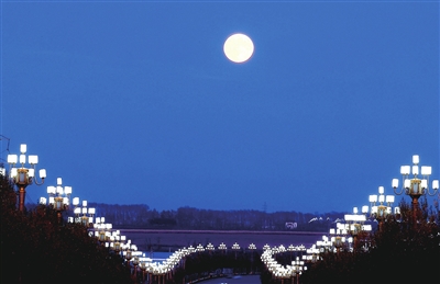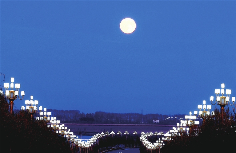 10月17日在黑龙江省北安市延安大街拍摄的“超级月亮”。当日19时26分月球将迎来“望”,也就是满月时刻,而17日8时51分月球又过近地点。专家表示,这是今年满月时刻与月球近地点时刻最接近的一次,两者相差不到11个小时,于是这轮满月也就成为年度最大满月,是一轮“超级月亮”。 新华社 发
