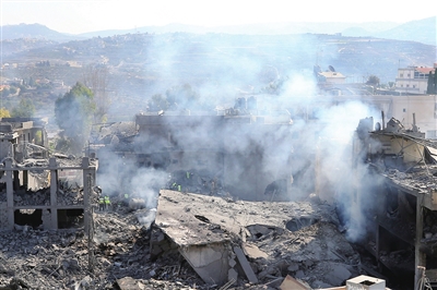 这是10月16日在黎巴嫩南部城镇加纳拍摄的遭摧毁的建筑。黎巴嫩民防部门16日通报,以色列对黎巴嫩南部城镇加纳的空袭行动已导致至少15人遇难、数十人受伤。 新华社 发