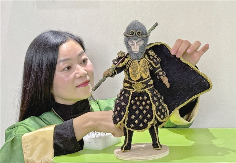 10月18日,杏花岭区非遗钩编技艺代表性传承人褚晶晶正在展示根据《黑神话:悟空》创作的钩编作品。 牛利敏 郝晨光 摄影报道