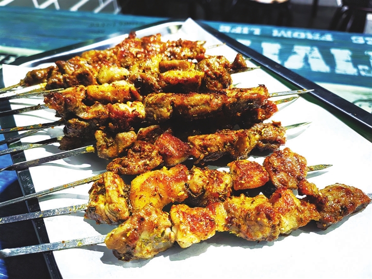 赵良东走进后厨,从储物柜中取出羊肉切好块,整齐地码于托盘中。每个肉块大小匀称,皆为1厘米见方,肥瘦肉搭配,间隔穿于铁签。1斤肉量,穿12串,刷油置于炭火上充分炙烤。熊熊火焰上,羊肉串被烤得嗞嗞作响,香味直往上蹿。他熟练地翻动着肉串,不一会儿,肉串变色,油脂渗出,撒上孜然、辣椒,调味料的独特香味与羊肉的鲜美味交织于升腾的烟雾中。烤好的肉串上桌,张伟成迫不及待拿起一串嚼起来,外焦里嫩,唇齿留香。“真好吃,就是这个味儿。”