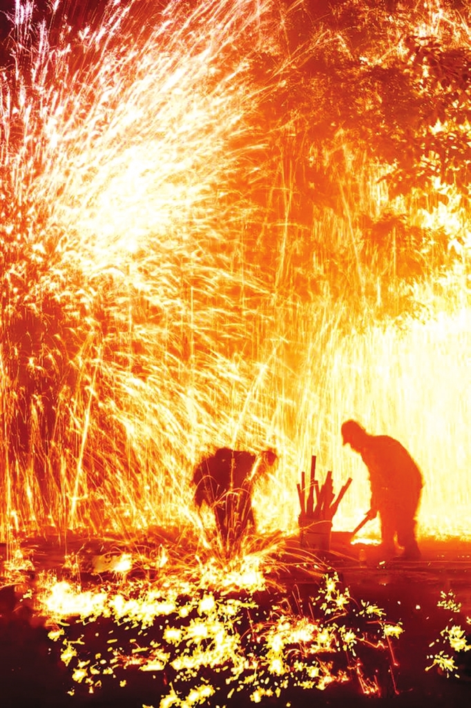 过去每到农历二月十五和十月十五的夜里,铁匠们便将烧红的铁水抛出,用木板击打至空中,铁水瞬间化作千万颗亮晶晶、光灿灿的星星,有如九天银河倾泻而下。这便是上党地区别具一格的铁礼花,当地人也叫铁骊花,其实是铁犁铧的谐音,因为打礼花用的是已经报废了的铁犁铧。