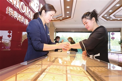 10月23日,消费者在浙江省湖州市德清县乾元镇一家金店挑选黄金首饰。