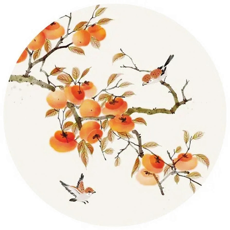 唐朝的刘禹锡则发现了柿子美丽温柔的另一面,他在《咏红柿子》诗中写道:“晓连星影出,晚带日光悬。”使晨昏之中的红柿有了诗意的美感。宋代陆游看重的是柿子成熟后带给人们的丰收喜悦,“墙头累累柿子黄,人家秋获争登场”,将繁忙的柿子丰收场景写入诗中。