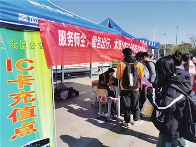 “你好,有没有关于公交卡使用规定、充值网点具体位置的宣传单?”“办公交卡多钱?”“刷卡乘车打折吗?”学生们咨询着公交卡各类问题,现场工作人员一一解答,同时详细介绍了如何充值、充值网点位置和用卡注意事项,还向学生们宣传了市内旅游景点及公交换乘线路。
