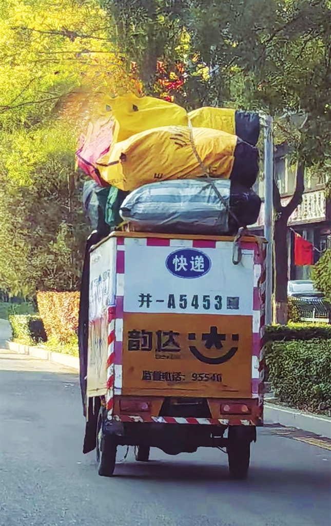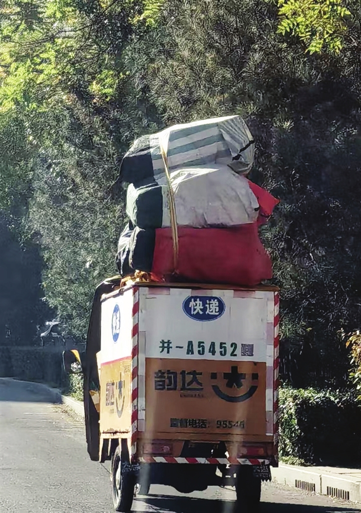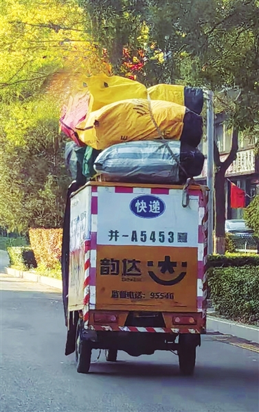 这是记者10月27日在文兴路拍到的图片。负责运送快递“最后一公里”的三轮车,除货厢内装着满满的快递外,车顶也被充分利用,堆着高高的快递。三轮车平衡性相对较差,再装上超重超高的快递,摇摇晃晃,非常危险。希望快递小哥在确保运输速度的同时,也要确保运输安全,避免类似情况上路行驶。