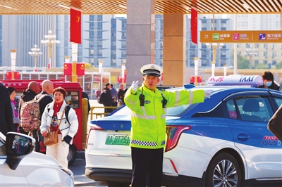 改造后的太原火车站站前广场实现接送客分离,太原铁路公安处交管支队为了保障交通顺畅,增派民警疏导交通。图为10月28日,交警在太原火车站出站口指挥交通。 王韵菲 狄佳玮 摄影报道