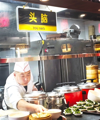 “一碗‘头脑’。”“好嘞。”早7时许,阳光路附近的一家饭店内,“头脑”稳坐“早餐之王”的地位,超七成食客专门奔它而来,今年62岁的食客付先生就是其中一位。“表面看像一碗白面糊,里面大有乾坤。”说着话,付先生用勺子在碗里搅动,汤内有羊肉块、羊髓、藕片、长山药。不止这些,里面还有酒糟、煨面、黄芪、良姜,共八味,也叫“八珍汤”。吃的时候,就上腌的韭菜、配一壶温黄酒,堪称人间美味。主食再配上一笼烧麦,更是一绝。