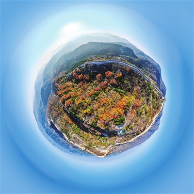 深秋时节,北京八达岭长城漫山遍野的红叶在阳光的映衬下如火似霞,与古朴的长城交相辉映,令人流连忘返。