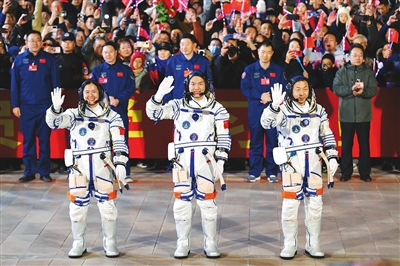 航天员蔡旭哲(右)、宋令东(中)、王浩泽在出征仪式上。
