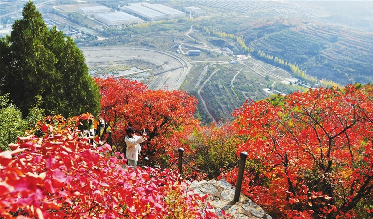 天龙山如油彩画一般,悄悄褪却着夏末绿色,群山被红叶遮掩,泉水被红叶浸染,道路被红叶铺就,一丛丛、一片片,红得炽热,红得诱人。真可谓“秋山映霞一川红,落叶逐流两岸枫”。