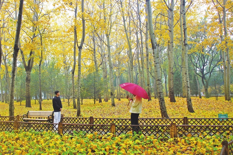 10月31日,一场秋雨让我市秋色渐浓,森林公园银杏林在雨中格外静谧美丽,游人观景拍摄,感受秋季之美。