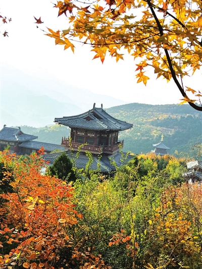 太山景区的树种繁多,有国槐、核桃树、桃树、杏树、椿树、枫树、黄栌树、榆树等品种。在这个季节,主要是黄栌树与枫树挥洒着浓墨重彩。黄栌树作为观叶树种,在园林中常丛植于草坪、土丘和山坡上。在通往龙泉寺山路的两侧,一株株五角枫树,金黄色的五角枫叶在阳光的照耀下,叶片的轮廓愈加锐利并闪闪发光。一簇簇的黄栌树,展放着遒劲的枝条,片片卵圆形的叶子,变成了熟褐或朱磦色,厚厚的叶片簇拥在一起,五彩斑斓,鳞次栉比。这些金黄、藤黄、熟褐、紫色、浅绛、红色等多种暖色的叶子叠加在一起,显得无比温暖与朝气蓬勃。