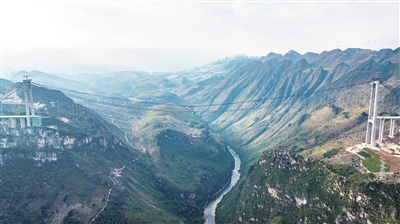 2022年开工建设的花江峡谷大桥,因跨越被誉为“地球裂缝”的花江大峡谷而得名,是贵州省六枝至安龙高速公路的控制性工程。全长2890米的大桥为钢桁梁悬索桥,桥面距水面垂直高度625米,建成后将成为新的世界第一高桥。