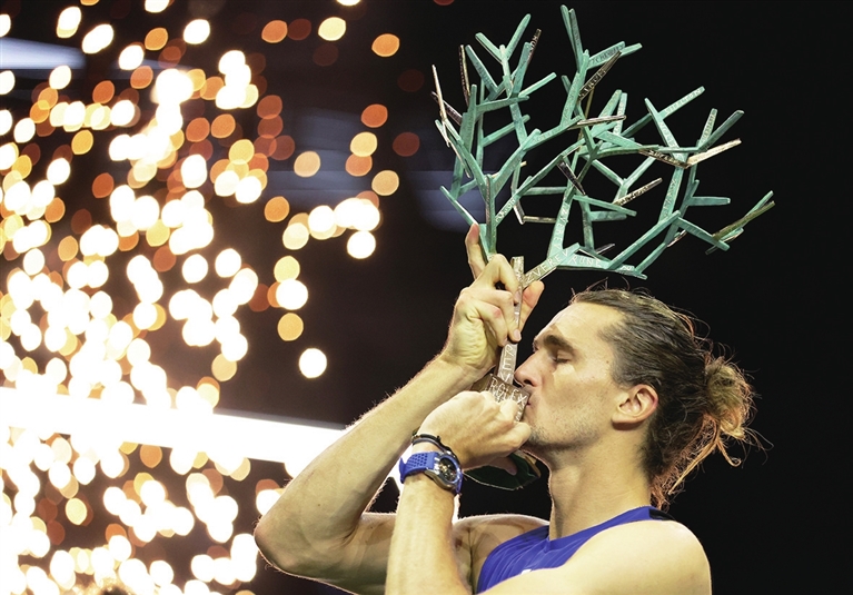 11月3日,在2024巴黎网球大师赛男子单打决赛中,德国选手兹维列夫2比0战胜法国选手安贝尓,夺得冠军。 新华社 发