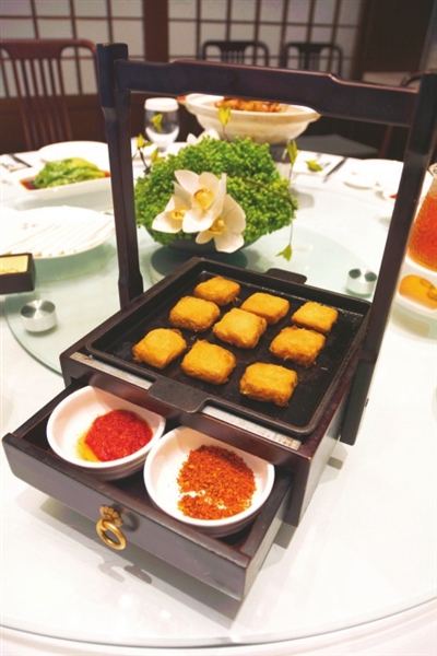 “安徽毛豆腐是必点菜之一,主打原汁原味。”山西徽粤楼(清控店)总经理王晋如数家珍,介绍起这道菜的魅力所在。此菜食材自安徽原生产地运送而来,主料为长有寸许白色绒毛的毛豆腐,温度、湿度都会对菜品口感有影响,储存环境极其严苛。