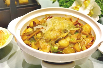 单看菜名,食材丰富。从卖相来说,极有食欲。这道菜汇集了花胶、海参、牛鞭、鲍鱼、鱼翅、杏鲍菇等十几种食材,经过泡发、炖、煮、焖、熬多道工序融合制作而成,营养极其丰富。但山西徽粤楼做的这道菜,食材加了炸豆腐、土豆条、鹌鹑蛋、粉丝儿等,妥妥的一款“晋味徽菜”。