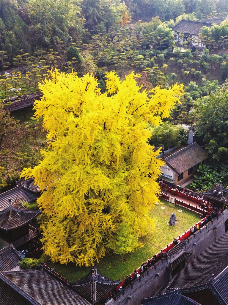 深秋时节,位于陕西西安长安区终南山下的千年古银杏迎来最佳观赏期,吸引众多游客前来观赏。