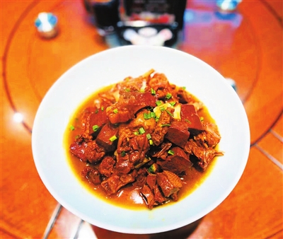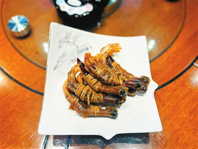 鸭脚包也是一道特色菜,它是采用特殊工艺腌制的鸭脚,每个鸭脚中间裹着鸭心,外面再用鸭肠缠绕,蒸熟即可食用。鸭脚包风味独特,肉美而鲜,骨酥而脆,咬上一口,筋道生津。