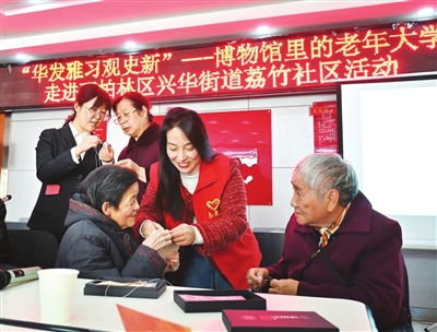 11月8日,山西博物院“华发雅习观史新”博物馆里的老年大学活动走进兴华街道荔竹社区,社区居民体验以芮城永乐宫元代琉璃鸱吻为原型的钥匙包制作。 郭苑甫 摄