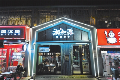 湘知源餐饮连锁企业在太原市开设4家直营店,门头使用蒂芙尼蓝、黑等颜色组合,上面“湘知源”三个行楷大字,在夜幕中非常醒目,极具辨识度。店内,常德丝弦、武陵人捕鱼、制钵子的工笔画以及常德当地人物景色装饰画、背景墙,带来了常德地方文化气息,为食客们营造了特色就餐环境。