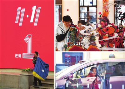 11月11日,我市商家举办各种促销活动,一派繁忙。左图为快递小哥一上午就在钟楼街收到300余件商家发货快递;右上图为“跟着悟空游山西”成为促销大卖点;右下图为商家在直播带货。