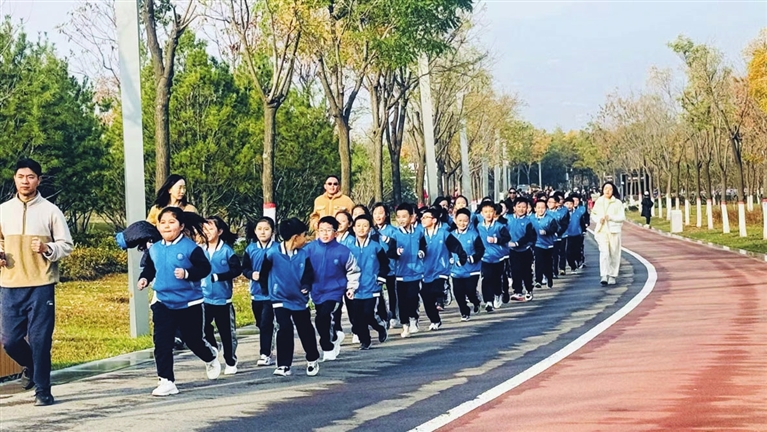 初冬时节,晋阳湖畔风光如画,阳光透过五彩斑斓的秋叶洒在便道上。“加油!”随着一声枪响,孩子们争先恐后向前奔去。一边欣赏着美丽的大自然,一边努力奔跑,一个个如风少年展现出无穷的活力。虽然跑得满头大汗,但孩子们沉浸在运动的愉悦中,互相鼓励、打气,展现出团结友爱的优秀品质。