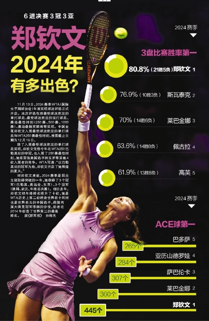 对郑钦文来说,2024赛季是职业生涯取得突破的一年,她获得了3个冠军(巴勒莫、奥运会、东京)、3个亚军(澳网、武汉、年终总决赛)。相比去年,郑钦文把年终排名提升了十位,她是WTA历史上第二位跻身世界前十同时也是世界前五的中国选手,跟随两届大满贯冠军李娜的步伐,后者在2014年创造了世界第二的最高排名。