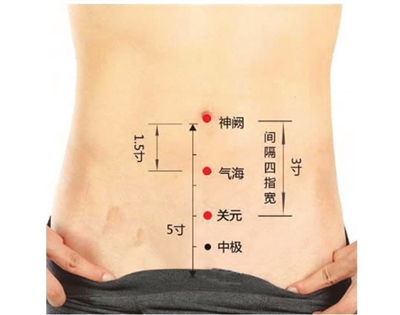 关元穴在下腹部,前正中线上,脐下3寸。可用手指来量,将食指、中指、无名指、小指并拢,肚脐以下大概4个横指的距离就是关元穴。