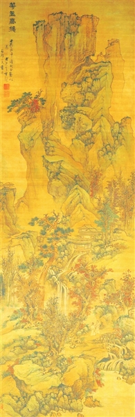该画是一幅描绘西岳华山风景的巨轴,整幅画以浅绛色彩为主,布局取“高远法”层叠而上,气势雄伟,生动表现了华山高峻浑厚的气象。