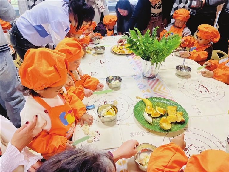 “来,咱们比试一下,看谁切得又快又好。”在老师的安全指导下,孩子们拿起特制的“刀具”,有模有样地切起各种水果。过程中,孩子们对不同水果的形状、颜色和质地有了直观了解,孩子们亲身体验了自己动手的快乐和成就感。