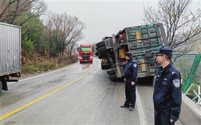 当天,细雨绵绵。杜交曲派出所民警、辅警在巡逻过程中发现,一辆重型牵引货车侧翻在道路上,情况危急。民警、辅警迅速反应,立即跑到跟前援手救助。