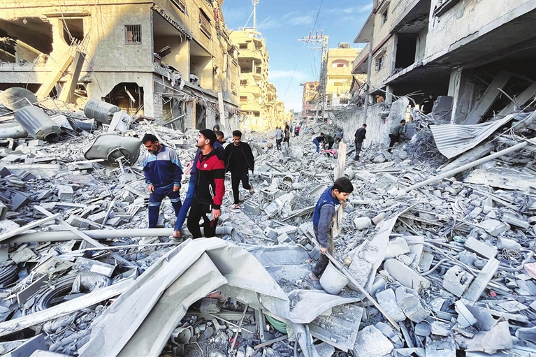 11月17日,在加沙地带北部城镇拜特拉希亚,人们聚集在一幢遭袭房屋的废墟附近。 新华社 发