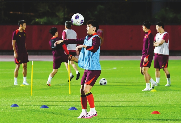 11月17日,中国队球员王振澳(前)在训练中。当日,中国国家男子足球队在福建厦门训练,备战19日与日本队的2026年美加墨世界杯亚洲区预选赛18强赛。 新华社 发
