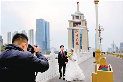 迎泽大街改造以来,以全新的面貌和怡人的景色,成为我市重要打卡地。图为11月19日,市民在迎泽大桥拍摄婚纱照。
