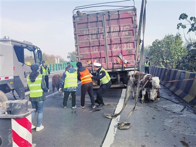 交警和高速公路工作人员及热心路人试图将牛犊赶回车上,但牛犊犯了牛脾气,左冲右撞不肯就范。最后,交警用车辆将路段封堵,众人齐心协力1个小时,才将牛犊都“请”回车上,恢复了交通。