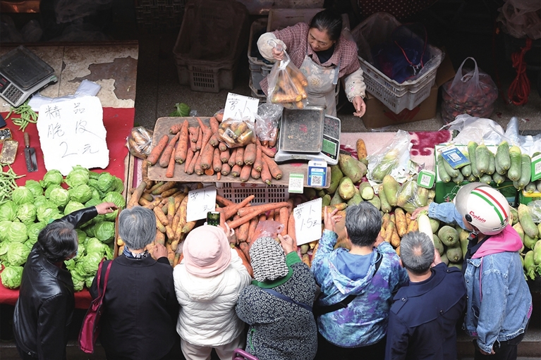 近期,我市蔬菜价格下降,常见的叶类菜价格较上月下降近四成,让市民的“菜篮子”拎得更轻松。图为11月18日,省城一菜市场内,市民选购蔬菜。 邓寅明 摄