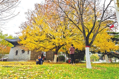 11月19日,府西街地铁站外游园被金秋渲染得金色灿烂,宛如浪漫的童话世界。 郭苑甫 摄