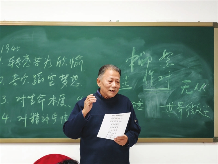讲台上的老人鬓发尽白、面容清癯,双眸温和,衣着简朴。手中的粉笔不时在黑板上舞动,字迹工整有力。做起朗诵示范来,激情四射、铿锵有力。