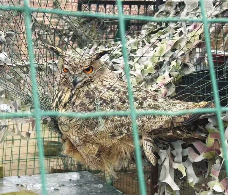 11月19日上午8时许,山西汾河水库管理有限公司职工宿舍院内,一名职工准备外出时,看到鸡舍上方的渔网处困着一只大鸟。职工走近仔细一看,这只大鸟竟是国家二级保护动物雕鸮(俗称猫头鹰),随即向娄烦县公安局杜交曲派出所求助,请求民警前来救助。