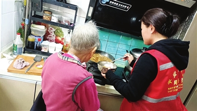 每天早晨上班前,张美峰先去老人的家里准备早饭,多为鸡蛋、牛奶和面包。中午,她从单位出来,先到附近市场买菜,然后入户直奔厨房忙活。淘米、煮饭、炒菜,很快就做好了热气腾腾的家常菜。傍晚,回家之前,她依然先来看老人,准备好晚餐才走。