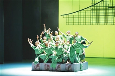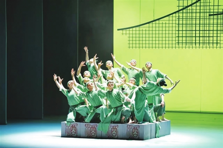 舞剧《牧童遥指杏花村》精心编排了男女群舞、双人舞、独舞等十几种风格各异、精彩纷呈的舞蹈。舞蹈动作新颖独特、风格鲜明、别具一格,充满了令人惊叹的艺术张力。特别是将汉唐古典舞蹈语汇与当代舞蹈表现手法巧妙融为一体,打造出了不同于山西传统审美风格的舞台艺术作品。这种独具匠心的融合,实现了古代文化和现代审美的完美交融,展现了杏花村的宁静祥和以及帝王也会有的“爱而不得”的人生遗憾,让观众在欣赏舞剧时既能看到超越故事、人物之上的青春与爱情本身的美好,又能在其中留下广阔的想象空间。此外,不可或缺的杏花村汾酒酿造工艺也在舞剧中得到了精彩绝伦的展现。充满活力、激情四溢的酒工舞,仙气飘逸、如梦如幻的酒仙舞,让醇厚的酒香仿佛弥漫在整个舞台,观众仿佛置身于古老的酒坊之中,目睹千年传统酿造工艺的神奇与魅力。