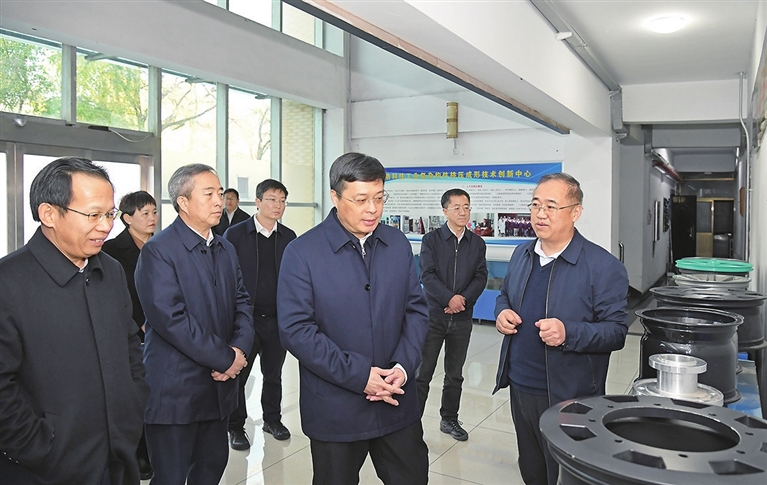 韦韬首先来到中北大学精密成形工程中心,听取研究方向、科研成果、人才队伍等情况介绍,察看新材料产品展示,询问产品性能、应用领域等,走进试制车间察看锻造设施设备,详细了解技术优势、工艺流程,与相关负责人深入交流,对他们在国防建设、航空航天等领域作出的贡献给予肯定和赞誉,勉励他们面向重大需求开展科技攻关,推进产学研深度融合,深化民用产品开发,更好地服务高质量发展。
