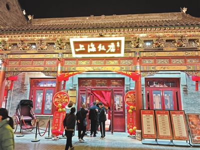 11月23日傍晚6时许,华灯初上,钟楼街人来人往,迎来了一天中最为热闹的时刻。沿街由西向东而行,路南处一座明清风格的复古建筑格外显眼,漆红色的柱子,门楣上悬挂着一块金光闪闪的复古气派毛笔体牌匾,中式飞檐翘角似是张开的双臂,迎接四方宾客走进这家上海饭店,品味美食,享受惬意生活。