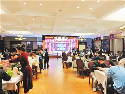 晚7时许,一楼散客就餐区,一桌年轻人拿起菜单认真翻看着。一番商量,他们点了贵妃荔枝虾球、鸡油黄汤蒸大白鱼、桂花糖藕等招牌淮扬菜,以及过油肉、羊肉锅等。