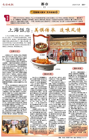 “上海饭店的前身是上海市久负盛名的鸿运楼酒家。从最初的鸿运楼酒家,到现在的上海饭店,已有近百年历史。”上海饭店经理陈艳介绍,1956年,经商业部批准,鸿运楼酒家成为支援内地建设的企业之一。同年10月,鸿运楼酒家在上海正式停业,开始内迁山西太原,一个多月后在太原市最繁华的钟楼街重装开业,并更名为上海饭店。“当时,带来了酒楼的全套厨具和38名员工。”陈艳说,上海饭店以经营沪菜、沪点为主,作为与林香斋、晋阳饭店齐名的太原市三大饭店之一,那个年代,能到上海饭店吃顿饭,可以炫上好几天。后来,由于各种原因,上海饭店淡出人们视野20多年。2021年,随着钟楼街的重建,上海饭店也重新开业,开启了新征程。