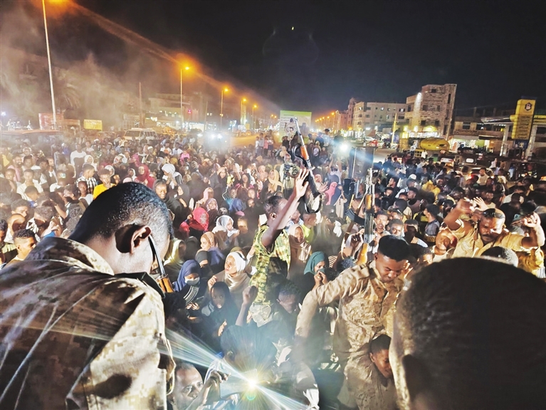 11月23日,在苏丹首都地区恩图曼市,民众自发走上街头,庆祝苏丹武装部队从苏丹快速支援部队手中收复辛贾市。