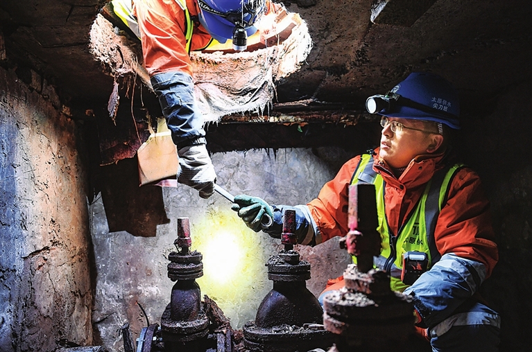 11月25日,太原供水集团城北营销分公司管道队尖刀班的维修人员在迎泽大街万邦国际南水表井室对自来水管道进行冬季巡检。寒潮来袭,该公司全力做好排查和整改设施隐患,保障冬季供水安全稳定。 牛利敏 摄