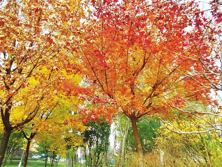 滨河东西路、阳兴大道两侧的黄栌也正当其时,尤其滨河西路迎泽大街到长风街段,黄栌与银杏、栾树、紫叶李等色彩鲜明的树木交织在一起,更添艳丽。尤其本周以来,我市天气转冷、北风劲吹,黄叶、红叶随风而落,在半空中翩翩起舞,如同一群蝴蝶仙子,为初冬的城市增添了一抹绚丽的色彩。