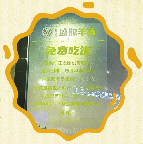 “免费吃饭!如果你在太原暂时没找到工作,没有收入,遇到困难,你可以来小店,告诉服务员来份‘好运套餐’。吃完直接走人就行了,不必客气!以后您有能力了,记得帮助一下身边需要帮助的人!谢谢!”从2018年开始,太原盛源羊汤的连锁门店就推出了“免费吃饭”的爱心活动,到现在已接待过上百位困难者免费就餐。