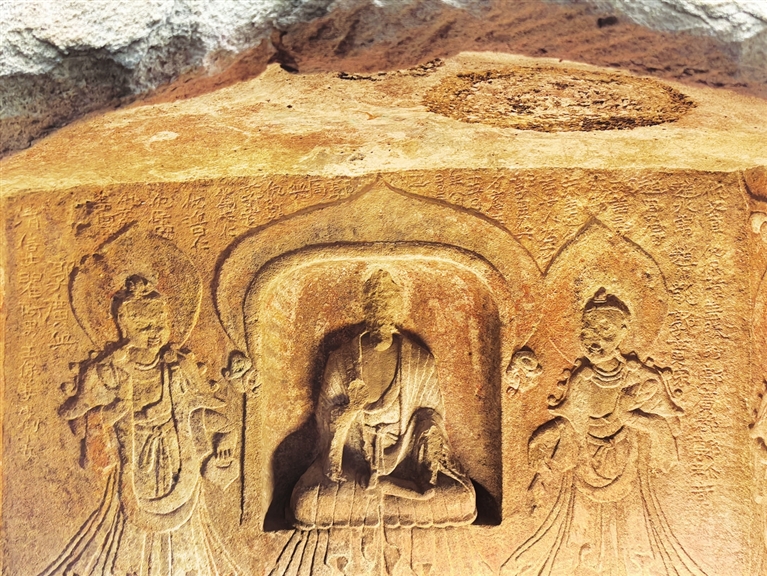 走近石窟,不免有几分失落,原以为会像云冈石窟、龙门石窟那样宏伟壮观,可是眼前看到的只有一方砂石、一个小小的洞窟、几尊雕像。1500多年的时光将石窟蒙了一层岁月的包浆,残缺不全的雕像依照1500多年前的姿势,维持着1500多年前的模样,让人不由得顿生怜惜之情。